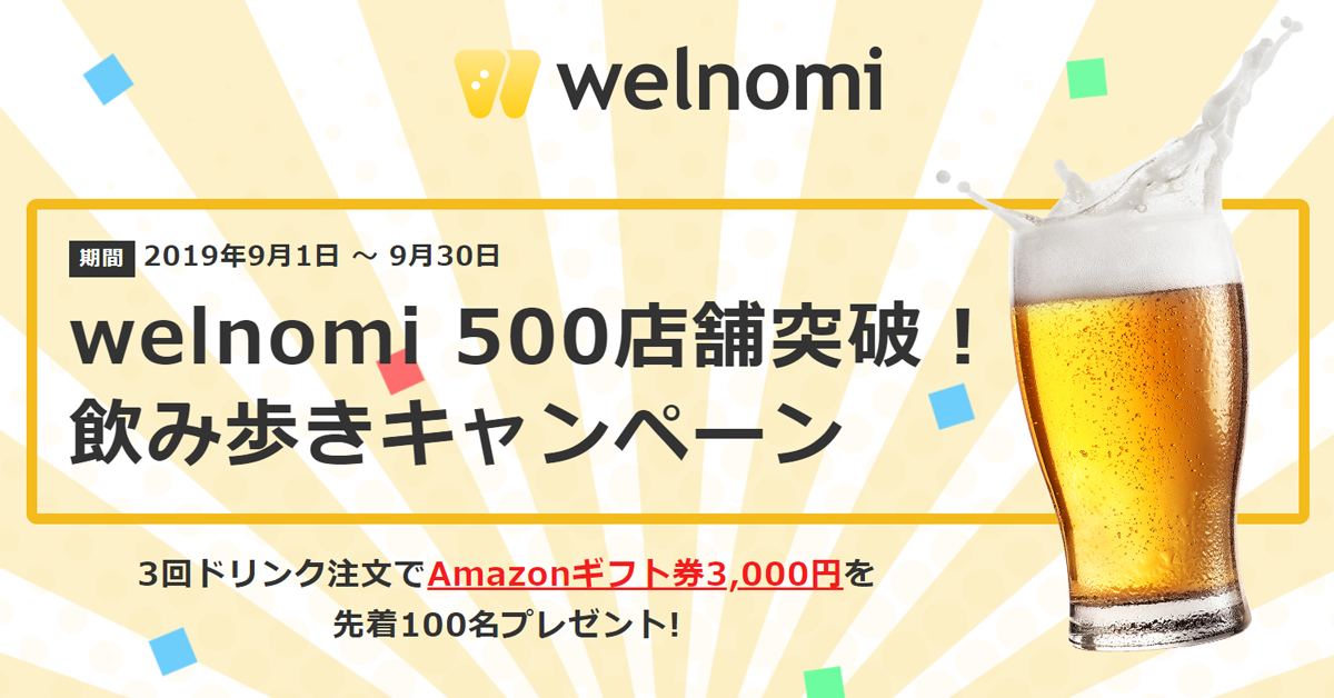 掲載店舗500店舗突破を記念し、welnomiでドリンク注文を3回以上行ったユーザーに先着100名でAmazonギフト券をプレゼントしているとのこと!
