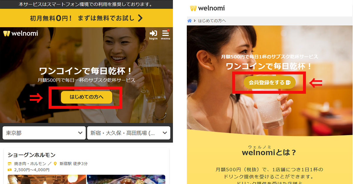 welnomi(ウェルノミ)は、掲載されている店舗で一杯目が無料になる、月額500円(税抜・初月無料)のサービスです。しかも毎日使えて何店舗でもOK!