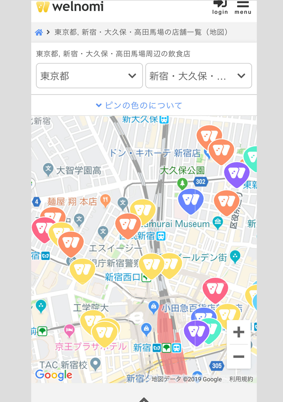 地域を新宿にした場合のマップ表示です。新宿駅周辺だけでも多くのお店で利用できそうですね。