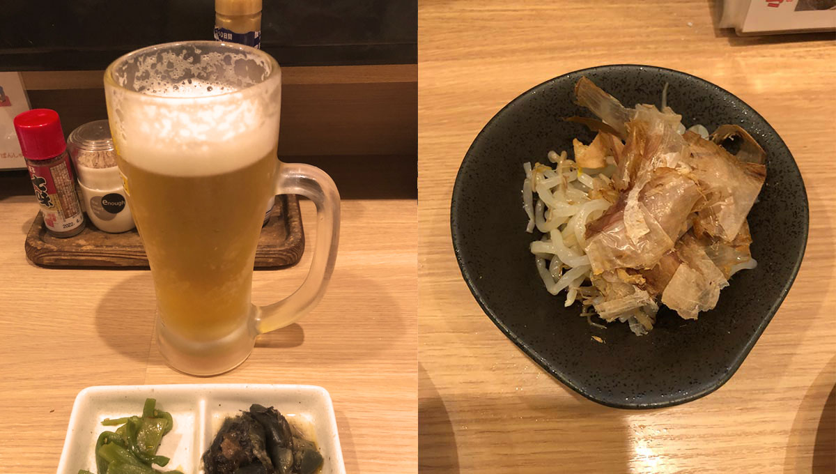 早速ビールを頼んだらなんとこの日はもやしが無料とのことで1杯目の時点でお通し含めこの状況です。