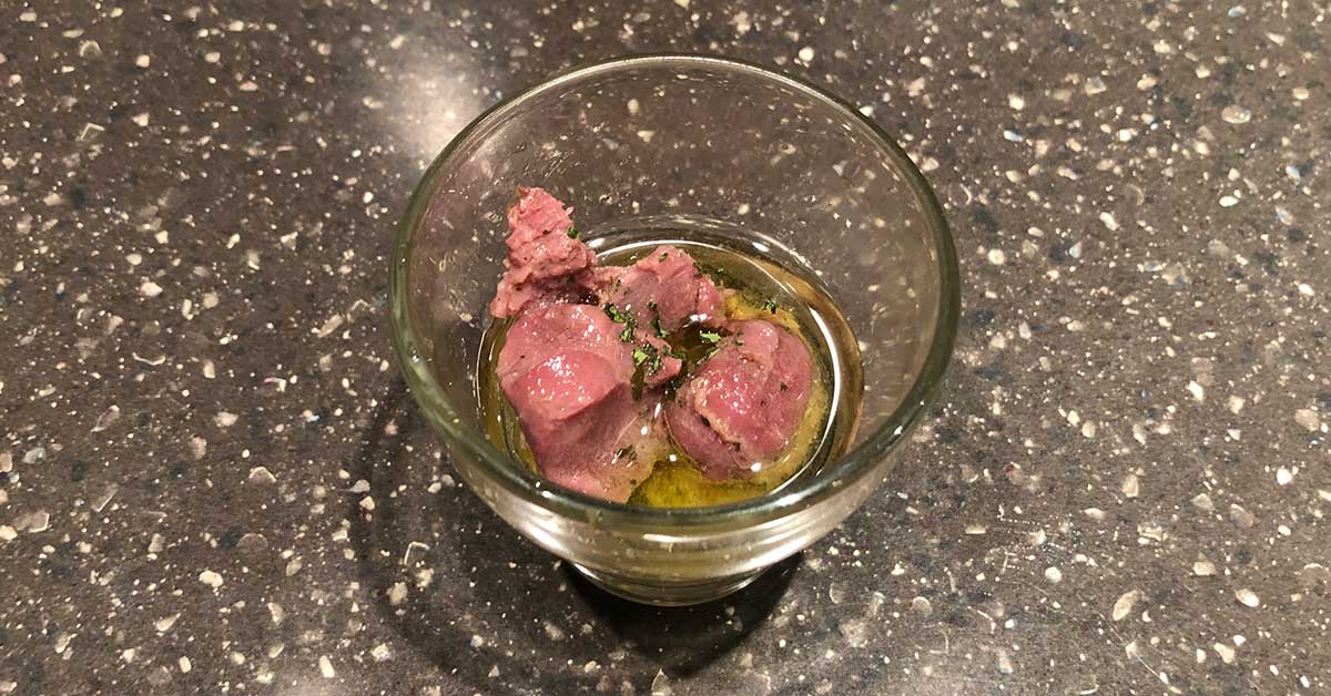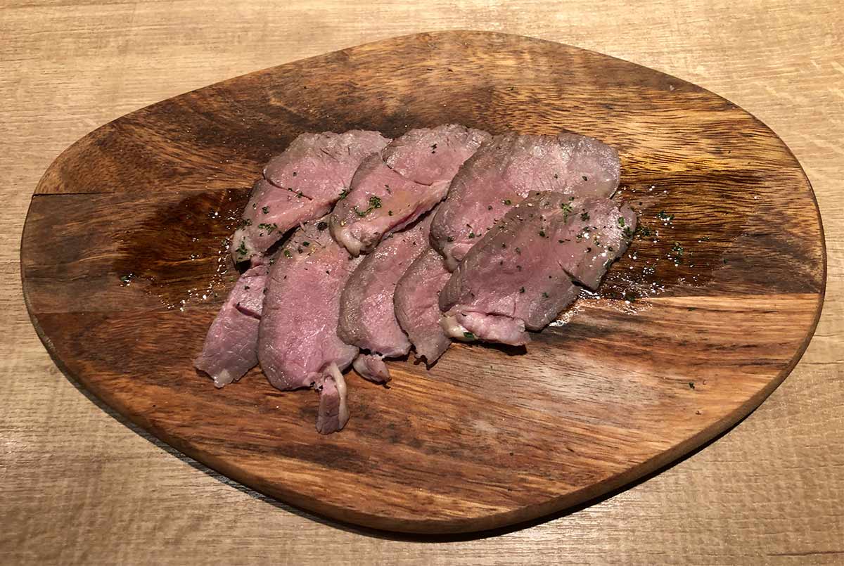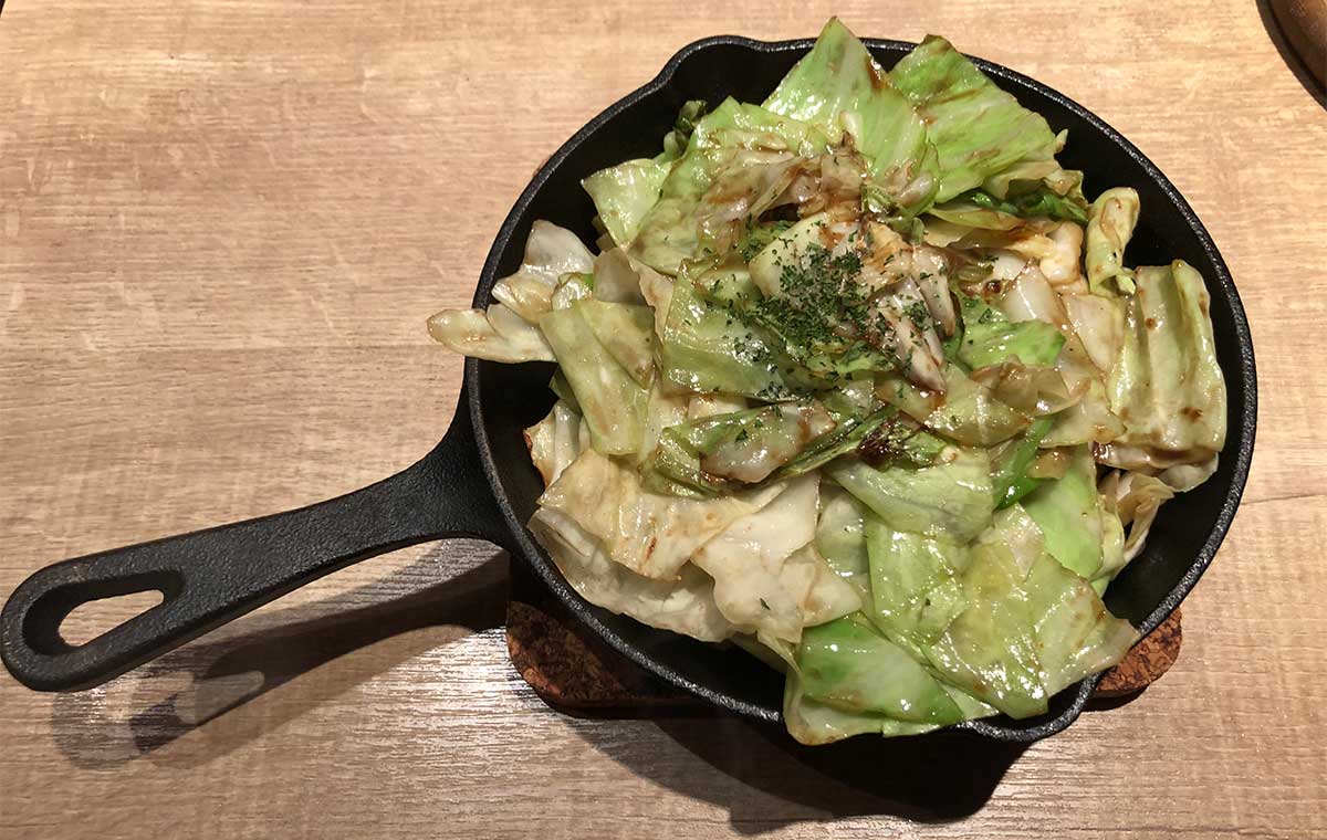 食べ物は「アンチョビキャベツ」と「ラムの赤身炙り刺し」をチョイス。中年なので体を気遣っての野菜と、さすがにかなり満腹なのでさっぱり系の刺しをチョイス。