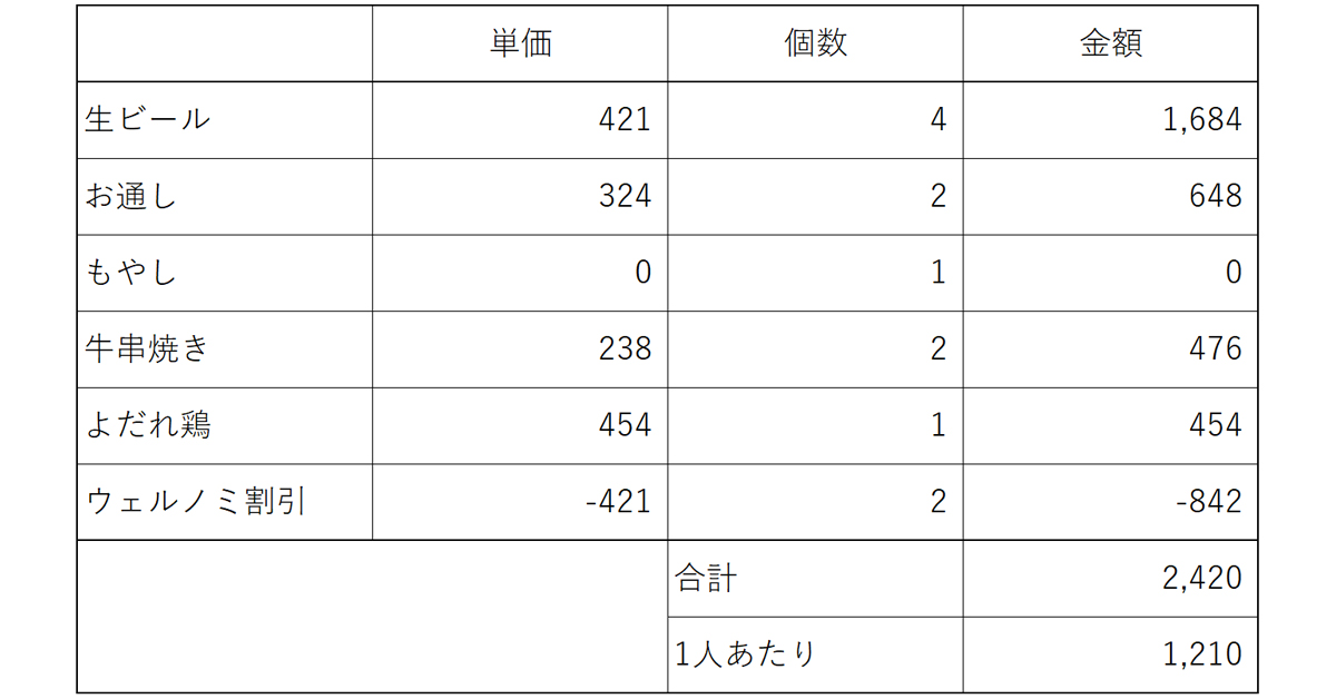 ※金額は税込み価格です。会計は1人あたりなんと1,210円(税込)!安い!