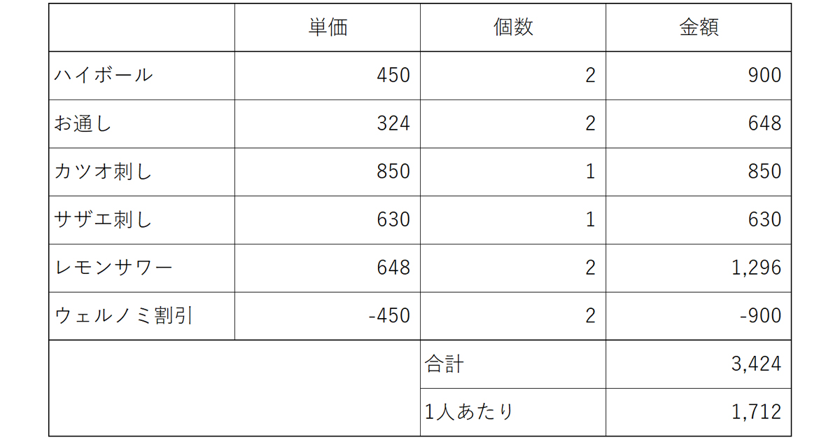 ※金額は税込み価格です。会計は1人あたりなんと1,712円(税込)!これまた安い!