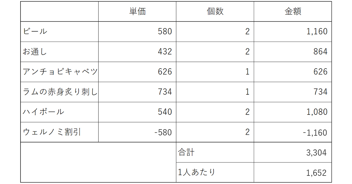 ※金額は税込み価格です。会計は1人あたりなんと1,652円(税込)!最後も安い!